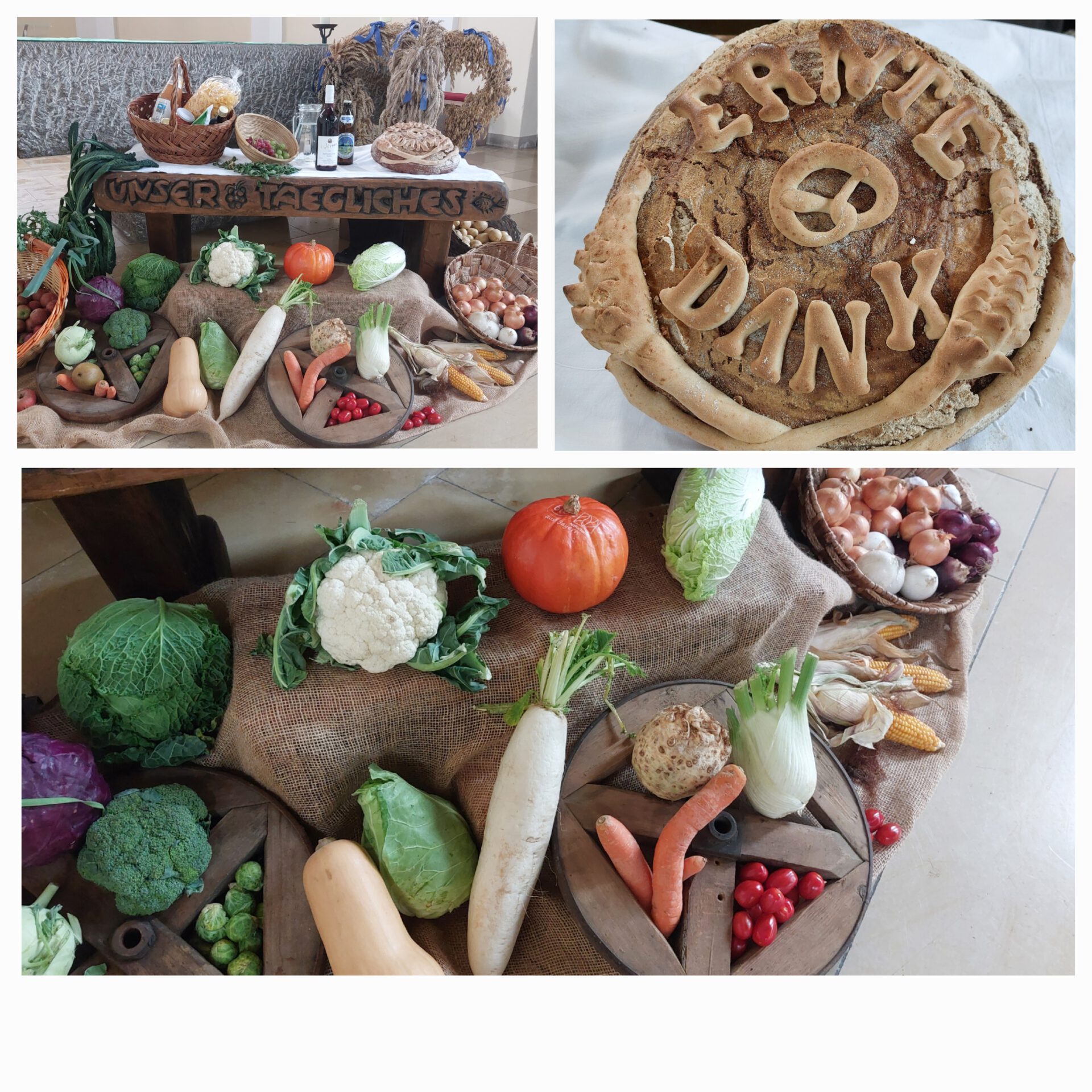 Der Erntedank-Gottesdienst am 5.10. wurde auch in Eichenau mit einem wunderschön geschmückten Altar mit Brot, Gemüse und Erntekrone gefeiert. Gleichzeitig wurden die Girlanden aus der Blumeninstallation "Die hängenden Gärten von Eichenau" verkauft. Der Erlös geht an "Frauen helfen Frauen FFB".