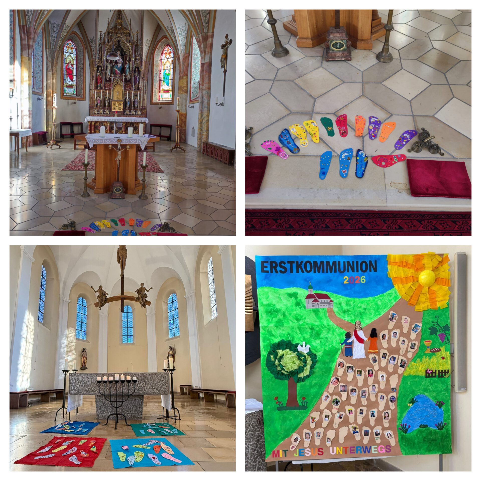 Die Erstkommunionvorbereitung der Erstkommunionkinder 2026 unseres Pfarrverbandes Eichenau-Alling zum Thema "Mit Jesus unterwegs" hat begonnen. Zum ersten Vorbereitungstreffen am 22.11.25 haben unsere Erstkommunionkinder ihre eigenen Fußabdrücke sehr bunt verziert und gestaltet und zum Familiengottesdienst am Sonntag, den 23.11.25, vor den Altar gelegt - als Zeichen ihres eigenen Weges mit Jesus. Wir wünschen unseren Erstkommunionkindern und ihren Gruppenleiterinnen alles Gute und viel Gottes Segen für ihre Vorbereitung.