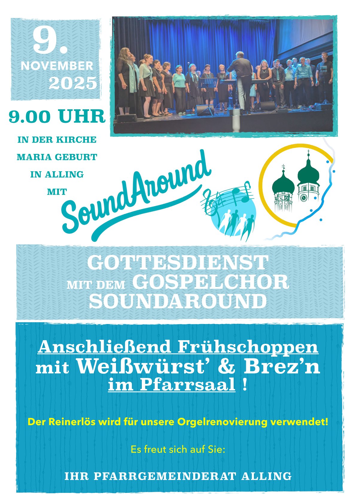 Am 9. November wird der Gottesdienst musikalisch gestaltet vom Gospelchor SoundAround. Anschließend bewirtet Sie der Pfarrgemeinderat im Pfarrsaal zum Frühschoppen!