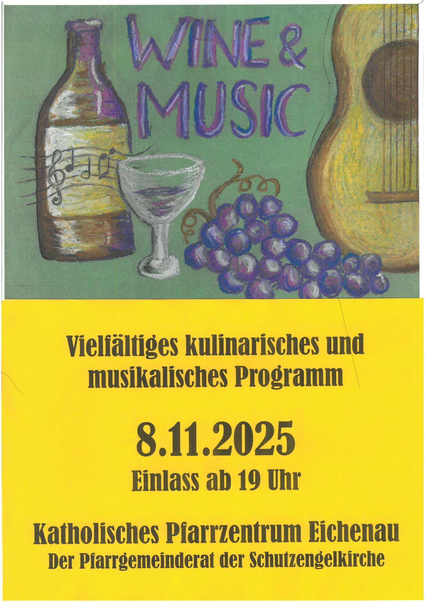 Am 8.11.25 findet unser beliebtes Weinfest im Eichenauer Pfarrzentrum statt. Ab 19 Uhr erwartet Sie ein tolles musikalisches und kulinarisches Programm. Wir freuen uns auf Sie!